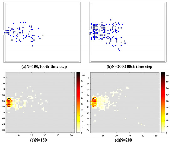 In order to better analyze the influence of age on evacuation, the age composition ratio of young, middle-aged, and the elderly is taken as 1:0:0, 0:1:0, and 0:0:1, respectively, and the number of evacuees, , is taken from 50 people to 400 people by the interval of equal difference of 50. The pheromone diffusion radius 3.2 . The ratio of male to female gender composition is taken as 1:1. After computer simulation, the evacuation time is shown in Figure 11. When is lower than 150, the evacuation time of the middle-aged group is not much different from that of the youth group (the evacuation time of the youth is slightly smaller than that of the middle-aged, for example, the evacuation time of the youth is 5% less than that of the middle-aged for ), but the evacuation time of the elderly group is 33~42% and 23~31% higher than that of the youth and middle-aged groups, respectively. When the number of evacuees, , reaches 400, the gap widens further, with evacuation times for the older age groups being 47 and 31% higher than for the young and middle-aged, respectively, at which point the evacuation times for the young are more or less 11% higher than for the middle-aged. From the above analysis, it can be seen that the correlation between evacuation time and age composition is large, especially with the increase in the number of evacuees, the evacuation speed of young and middle-aged people is significantly better than that of the elderly. After observing the simulated evacuation process, it was found that when , the evacuation exit reaches the maximum throughput, and the people who cannot escape from the exit in time gather near the exit and compete with each other leading to prolonged evacuation time. Taking and 200 as an example, the age composition is all elderly, and the distribution of people and the competition of grid points when the evacuation process is iterated to the 100th step is shown in Figure 12. As can be seen from Figure 12, when , there is no significant congestion at the exit, and when , there is a significant gathering of people at both flanks of the exit, and the maximum number of lattice point competitions at is nearly twice as high as that at (Gray indicates that the number of lattice point competitions is zero; the darker the color, the more intense the competition for lattice points).