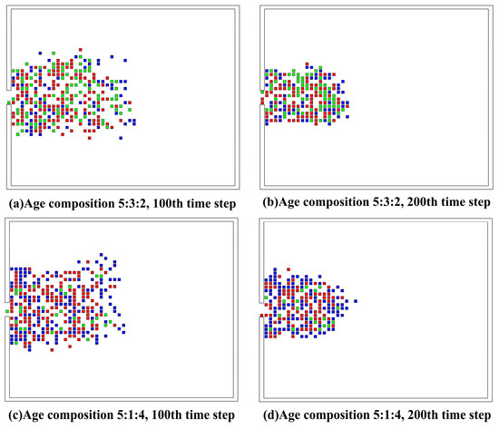 When the age composition is taken as 1:0:0, 8:1:1, 6:2:2, 5:3:2, 5:2:3, and 4:3:3, the evacuation time varies as shown in Figure 13a. An increase in the percentage of youth has a positive effect on the reduction in evacuation time, with a 10% reduction in evacuation time when the percentage of youth increases from 40% to 80%. The age composition 5:3:2 and 5:2:3 curves show that when young people are the main body of pedestrians, an increase in the number of older people leads to an increase in evacuation time. Taking 400 as an example, the distribution of the 100th time step and 200th time step walkers with age compositions of 5:3:2 and 5:1:4 is shown in Figure 14, where the red squares denote the youth, the green squares denote the middle-aged, and the blue squares denote the elderly. By observing the evacuation process, it can be seen that the increase in the number of elderly people in the composition of the population leads to more elderly people in the middle and back of the crowd, which increases the evacuation time. Also from Figure 14 it can be observed the classical characteristic phenomenon in the dynamics of pedestrian flow evacuation ‘arch-forming blockage’ [39], with an arch-shaped distribution of people at the exit.