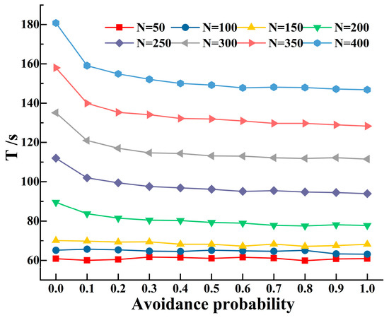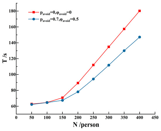 is taken as 0.5, age composition is taken as 4:3:3, gender composition is taken as 1:1, and the relationship between avoidance probability and evacuation time is shown in Figure 19. When the number of pedestrians is below 150, the avoidance probability has little effect on evacuation time. When the number of pedestrians is above 150, evacuation time reaches a minimum at avoidance probabilities of 0.4 to 0.6 and levels off thereafter. Taking N = 400 as an example, the probability of avoidance is taken at 0.1 intervals from 0 to 1 in this order, and the evacuation time is reduced by 12%, 14%, 16%, 17%, 18%, 18%, 18%, 18%, 18%, 19%, and 19%. Avoidance behavior improves the predicament of vulnerable people during evacuation and reduces their risk during evacuation.