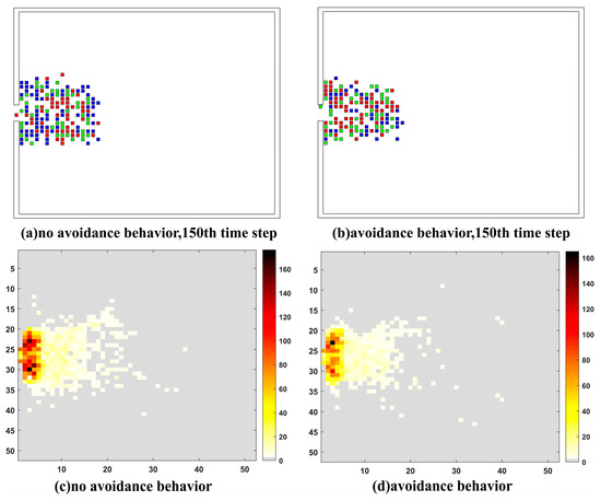 = 0.5, = 0.7, is taken from 50 to 400, the difference is taken as 50, 3.2 , the age composition is taken as 4:3:3, the gender composition is taken as 1:1, and the comparison of evacuation time with and without avoidance behavior is shown in Figure 15. When the number of pedestrians is less than 150, the presence or absence of avoidance behavior has little effect on evacuation time due to the low number of pedestrians in the space, the abundance of available evacuation space per capita, and the lack of competition between pedestrians. When the number of pedestrians is higher than 150, the avoidance behavior can significantly reduce the evacuation time when the avoidance behavior reduces the total evacuation time by 12 to 17% compared with no avoidance behavior. Taking as an example, the distribution of walkers and the competition of grid points at the 150th time with or without avoidance behavior are shown in Figure 16. Under the avoidance behavior, the elderly people in the middle and the back section of the crowd near the exit are obviously reduced, while the competition of the grid points near the exit is obviously weakened, and the disadvantaged groups in the crowd can arrive at the exit more quickly and reduce the evacuation time.