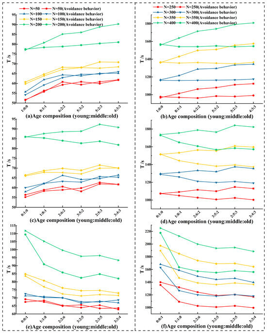 When the age composition of young to middle-aged to old is in the ratio of 1:0:0, 8:1:1, 6:2:2, 5:3:2, 5:2:3, 4:3:3, with or without avoidance behavior, the age composition of the pedestrians and the relationship between the evacuation time is shown in Figure 17. The presence or absence of avoidance behavior had little effect on evacuation time when the number of pedestrians was below 150 was not affected by age composition. From Figure 17a,d, it can be seen that when the young and middle-aged are the main body of pedestrians, both show the characteristics of avoidance behavior that has the greatest impact on evacuation time when the age composition of pedestrians is complex. For example, with , age compositions of 4:3:3, 3:4:3, 8:1:1, and 1:8:1 resulted in 19%, 18%, 6%, and 8% reductions in evacuation time with avoidance behaviors.