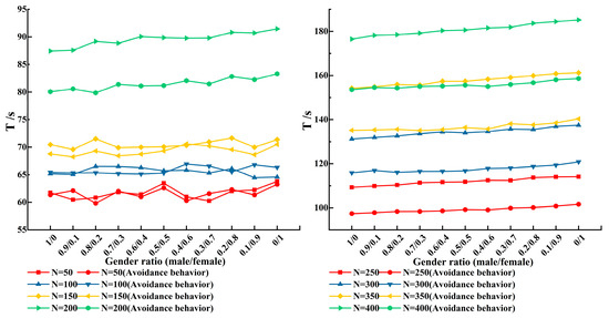 The age composition is taken as 4:3:3, and the ratio of male to female is linearly interpolated from 1 to 0 in steps of 0.1, and the sum of the ratios is 1. The relationship between the gender ratio and the evacuation time with and without avoidance behaviors is shown in Figure 18. The presence or absence of avoidance behavior has little effect on evacuation times when the number of pedestrians is less than 150 and is not affected by gender composition. When the number of pedestrians is higher than 150, the rate of change in evacuation time with the gender ratio is stable, and the effect of avoidance behavior on evacuation time is not affected by the gender composition.