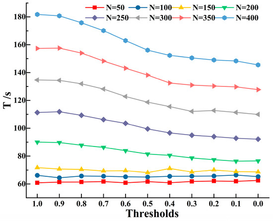 is taken as 0.5, age composition is taken as 4:3:3, gender composition is taken as 1:1, and the relationship between avoidance threshold and evacuation time is shown in Figure 20. When the number of pedestrians is below 150, the avoidance threshold has little effect on evacuation times. When the number of pedestrians is higher than 150, the evacuation time decreases at a maximum rate from 0.4 to 0.8 of the avoidance threshold, and the evacuation time reaches a minimum at 0 of the avoidance threshold. In real life, the avoidance threshold of 0 is difficult to achieve, and because each person is an independent individual, they can freely choose to avoid or not; therefore, it is difficult to uniformly assess all the vulnerable groups to avoid. At the same time, from Figure 2, it can be seen that the maximum competitiveness of the elderly is in the range of 0.54 to 0.63, so in the process of evacuation, the competitiveness of the elderly as the avoidance threshold can maximize the effect of the reduction in evacuation time.
