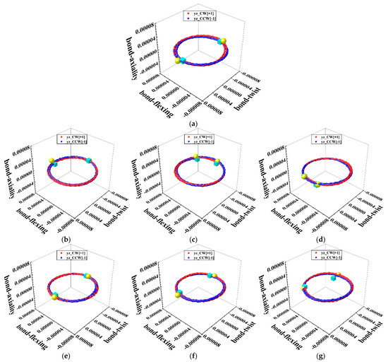 The variation of the Im-3m-H3S crystal graph S7-H1 BCP trajectories T(s) for 5.0 fs peaks of the clockwise (R, CW [+1]), right-handed (red) and counter-clockwise (S, CCW [−1]), left-handed (blue) circularly polarized ultra-fast laser pulses in the yz plane for the carrier-envelope phase (CEP) angle ϕ = 0°, 30°, 60°, 90°, 120°, 150°, 180° are presented in sub-figures (a–g), respectively. The start and end of each T(s) are denoted by yellow spheres and cyan cubes, respectively.