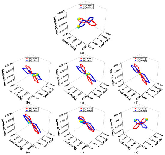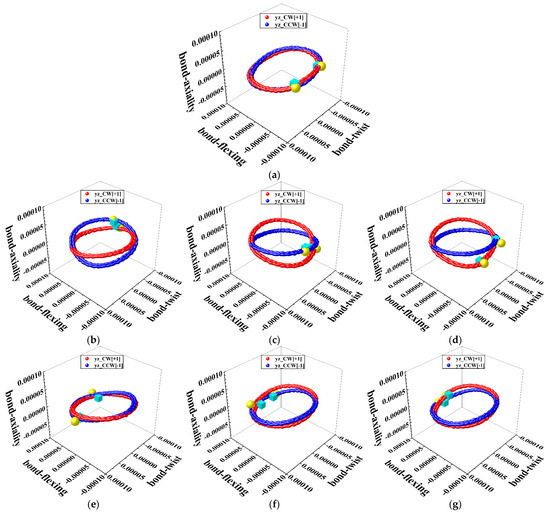Conversely, the tightly coiled T(s) of the S7-H3 BCP of the S and R stereoisomers undergo a rigid shift of 180° as the CEP angle is varied from ϕ = 0° to 180°, as can be observed by comparing the positions of the start (yellow spheres) and end markers (cyan cubes), from the top to the bottom, see the Section 2 and compare Figure 3a with Figure 3g. The geometric Berry Phase has vanished since there is a geometric Berry phase angle of 0°. For the S7-H3 BCP, a clear shift of the T(s) of the S and R stereoisomers is observed for a value of the CEP angle ϕ = 30°, see Figure 3b. After the pulse is removed, the T(s) of the S7-H3 BCP S and R stereoisomers uncoil for all values of the CEP angle ϕ and the rigid 180° shift of the T(s) is no longer present, see Figure 4.