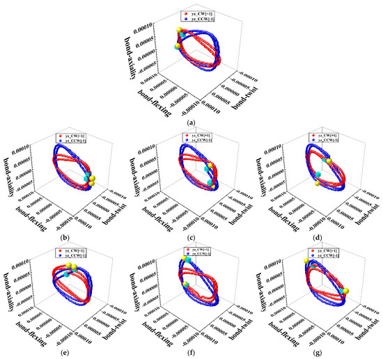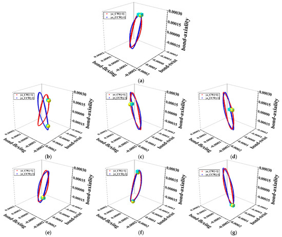 The variation of the Im-3m-H3S crystal graph S7-H3 BCP trajectories T(s) for 15.0 fs peaks of the CW (R, red) and the CCW (S, blue) circularly polarized ultra-fast laser pulses in the yz plane for the CEP angle ϕ = 0°, 30°, 60°, 90°, 120°, 150°, 180° are presented in sub-figures (a–g), respectively. For further details, see Figure 3.