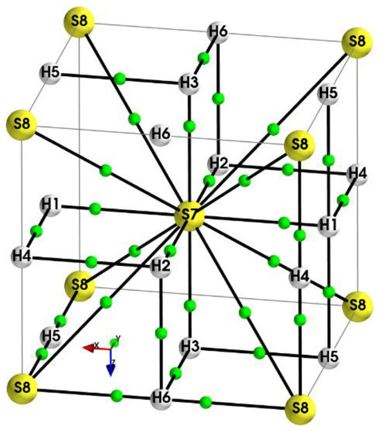 The crystal graph of the Im-3m-H3S unit cell at a pressure of 200 GPa in the yz plane before the pair of circularly polarized ultra-fast laser pulses are applied. Clockwise {CW, [+1}, right-handed (R) and counter-clockwise {CCW, [−1}, left-handed (S) pulses with peak electric (E)-field strength, E = 200.0 × 10−4 a.u. with carrier-envelope phase angles ϕ = 0°, 30°, 60°, 90°, 120°, 150°, 180° are used, see the Computational Details section. Bond critical points (BCPs) are represented by green spheres. Note the inset Cartesian X-Y-Z axes. Before application of the laser pulses, the corresponding interatomic separations are 2.70 a.u., 2.82 a.u., and 4.89 a.u. for the S-H bonds, H--H bonds, and S---S bonds, respectively.