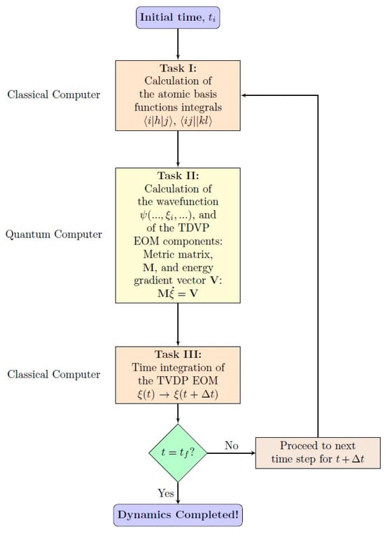 Flowchart of the main computational tasks in an END/QC/VQS dynamics executed on classical and quantum computers.