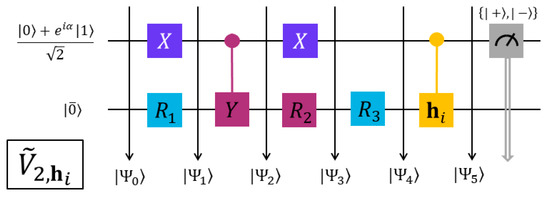 where now and , and and , cf. Equations (32)–(34). The terms in Equation (37) can be evaluated with our END/QC versions of the VQS circuit in Ref. [17]. We will illustrate such QC evaluations in the following section.