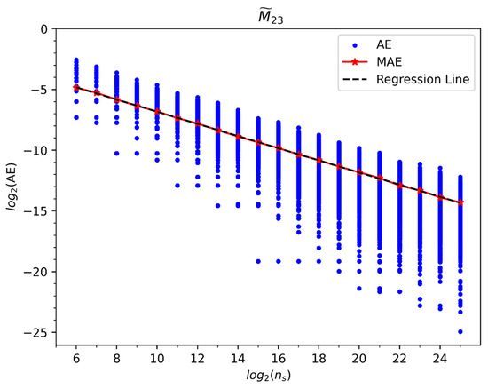 log2-log2 plot of the absolute error (AE) in QC calculations of the element vs. the number of shots . Values corresponding to END/QC variational parameters and , and circuit parameters and . AEs from 1000 repetitions per each appear as scattered blue dots, and their mean absolute error (MAE) per each appear as red stars. For the latter, a regression line with slope , intercept , and coefficient of determination appears as a black dashed line.