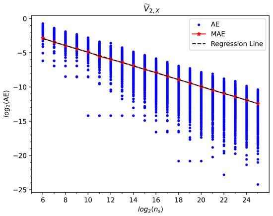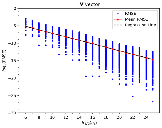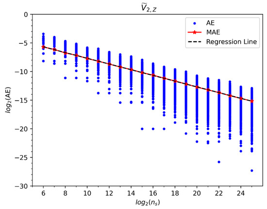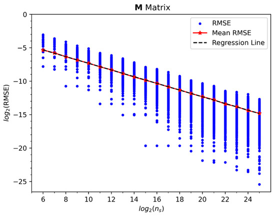 where is the value of an element/component of from the repetition of a QC calculation with shots, is the value of the same element/component from an analytical expression, Equations (47) and (48), is the number of elements/components of , and is the total number of repetitions = 1000; the RMSE is proportional to the Frobenius norm . Like in Figure 7, Figure 8, Figure 9 and Figure 10, we plot in Figure 12 and Figure 13 the , , and the regression line of the latter vs. of = and , respectively, for the values of the END/QC variational parameters and listed in Table 1. In addition, we plot in Figure 11 the log2 of the SD of the ’s with respect to its and its regression line vs. . Like in all previous QC calculations, the log2-log2 plots of the MRSMEs and SDs vs. show the same slopes with perfect linear correlations; furthermore, both metrics again scale asymptotically with an order .
