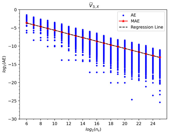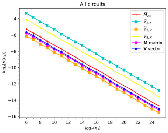where all the terms have been defined in/after Equation (55). In Figure 11, we plot the vs. of the QC calculations of , , , and and their corresponding regression lines. Like in the MAEs’ case, all the regression lines of the SDs show the same slope , with a perfect correlation with . This demonstrates that the asymptotic behavior of the error spread with respect to is of the order . The QC evaluations of the remaining elements and having circuit-evaluated components identical to zero and exhibit same behaviors and trends in their accuracy and precision.