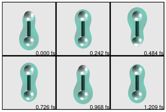 where is the overlap matrix of the atomic orbitals . and provide estimates of the total number of electrons around nuclei and , respectively. In Figure 14, we show six sequential snapshots of an END/QC/VQS/STO-3G computer animation of the pure electronic dynamics of H2+ at bond distance = 1.4 a.u. and from the initial conditions = 5° and = 0°. The distortion on the electronic density introduced by the initial variational parameters reproduces a perturbation on that density caused by an incoming ion or by an external electric field. The selected values of these parameters lead to a dynamics appropriate for validation and visualization. In each frame of Figure 14, white spheres represent the fixed H nuclei, and the green cloud depicts an electron density iso-value = 0.1 a.u. In the first frame at evolution time = 0 fs, we notice that the initial condition = 5° distorts the ground-state density conforming to the molecular symmetry into an upright pear shape density not conforming to symmetry but to the lower one. This reveals a spatial symmetry breaking [19,41,42] in and , which results from the combination of the spin-orbitals and from different irreducible representation in when = 5°, cf. Equation (58). In a sense, this superposition (“mixing”) of the spin-orbitals and its resulting symmetry breaking propel the subsequent dynamics. In the following frames, evolves to a -conforming shape at = 0.242 fs, to a -conforming downright pear shape at = 0.484 fs, again to a -conforming shape at = 0.726 fs, and finally to the initial upright pear shape at = 0.968 fs. This transformation of shapes repeats periodically in time. In chemical terms, these snapshots reveal that H2+ undergoes periodical intramolecular electron transfers between the two nuclei.
