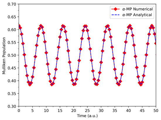 Finally, in Figure 15, we plot the electron Mulliken population on one of the nuclei of H2+ vs. time obtained by numerical integration of the END/QC equations, Equation (49), with the Shampine-Gordon predict-evaluate-correct-evaluate method [45] in PACE [4], and obtained from the analytical solution in Equation (58). Numerical and analytical results are identical as expected. Both types of Mulliken populations oscillate sinusoidally with the theoretical period = = = 8.0844 a.u., cf. Equation (58), where = −1.2528 a.u. and = −0.4756 a.u. in H2+ with = 1.4 a.u.. Figure 15 also reveals the aforesaid intramolecular electron transfers.