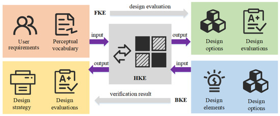 Because subjective human feelings are often very complex and might conflict with each other, product design evaluations based on traditional KE show lower-quality results in terms of generalizability [40,41]. From this basis, the concept of HKE was first proposed by Matsubara and Nagamachi [42]. The HKE model is shown in Figure 1, and consists of two sub-systems, namely FKE and BKE. In FKE, user requirements are inputted through perceptual imagery vocabulary, and design options and design evaluations are outputted; in BKE, design elements or design options are inputted, and design strategies and design evaluations are outputted.
