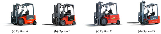 A total of four products with the highest utilization rate and that meet the design requirements were selected; the scheme of the four electric forklifts is shown in Figure 4.