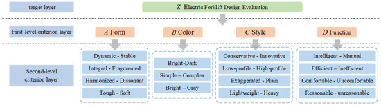 The constructed design hierarchy model for an electric forklift is shown in Figure 5. The target layer is an electric forklift design evaluation, which is indicated by the letter Z. The 15 electric forklift phrases screened are used as the evaluation design elements in the second-level criterion layer, and are categorized into four features forming the first-level criterion layer, labelled “A form”, “B color”, “C style”, and “D function”.