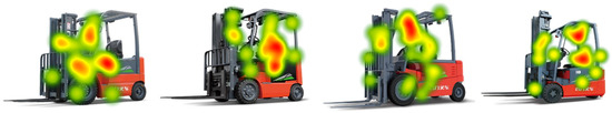 The subjects were tested for visual selective attention according to the presented electric forklift schemes. Attention time and visual attention hotspots within the AOI were recorded in real time for each subject in turn for the four electric forklift design scenarios. After completing the experiment, eye movement type (fixation, saccade, blink), gaze tracking, and an indication of which AOI the gaze point was located in were exported. A case of one subject’s area of interest is shown in Figure 6.