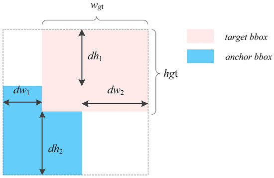 Here, I denotes the intersection between the predicted box and the target box, and U signifies their union. The variables dw1, dw2, dh1, and dh2 represent the absolute distances between corresponding edges of the predicted box and the target box, while wgt and hgt stand for the width and height of the target box.