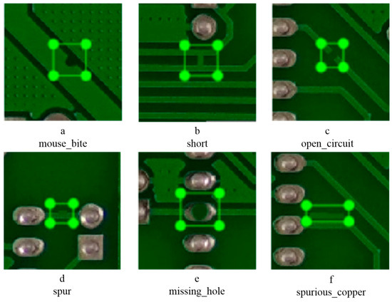 The experiments conducted in this paper make use of the PCB_DATASET, which was generously released by the Peking University Open Lab on Human Robot Interaction (PKU-HRI) [22]. This valuable dataset comprises a total of 693 images, each meticulously captured to showcase various defects commonly found on printed circuit boards (PCBs). These images cover six distinct and prevalent categories of PCB surface defects, ensuring a comprehensive representation of the issues that can arise during the manufacturing process. To provide a clearer understanding of these defects, Figure 6 offers a detailed visual illustration, highlighting the specific characteristics and variations within each category. This figure serves as a crucial reference for researchers and practitioners alike, facilitating the identification and analysis of different defect types. Moreover, the dataset has been meticulously annotated to enhance its usability for machine learning and image processing tasks. Each defective area within the images is carefully marked using rectangular boxes, providing a precise indication of the defect’s location and extent. Complementing these annotations, each image is accompanied by an xml file that contains vital metadata, including the image size, the exact coordinates of the defective areas, and the corresponding defect category.