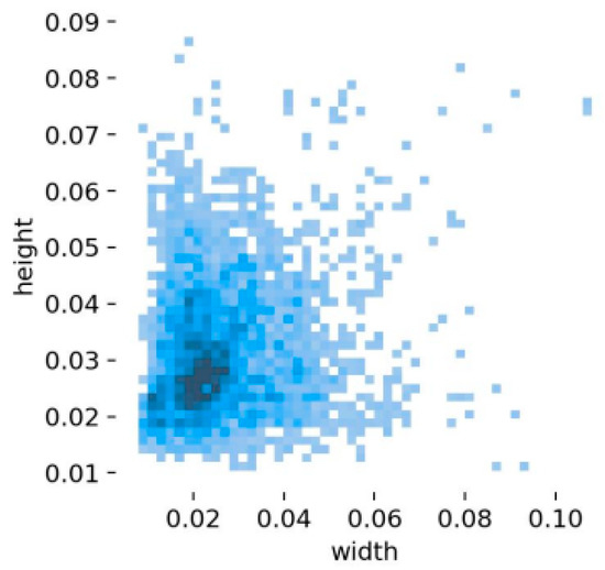 In addition, the width-to-height distribution of the dataset is vividly illustrated in Figure 7, offering a comprehensive perspective on the defect dimensions within the PCB images. It becomes abundantly clear that surface defects on PCBs predominantly consist of small target anomalies, with only a negligible fraction classified as medium-sized or large target defects. This statistical insight uncovers a distinctive characteristic inherent to PCB defects, emphasizing their propensity to manifest as minute imperfections on the board’s surface. Meanwhile, this observation also holds significant implications for the development and refinement of automated inspection systems. In addition, this peculiar distribution pattern not only underscores the intricacy involved in accurately detecting these tiny flaws but also underscores the necessity for algorithms tailored to recognize and differentiate such fine details amidst the complex circuitry background. Consequently, it has guided our methodological approach towards algorithm design, directing us to meticulously select and refine an advanced version of the YOLOv8 model. Our enhancements have been meticulously crafted with a sharp focus on improving small target recognition capabilities, ensuring that even the most inconspicuous defects are reliably identified.