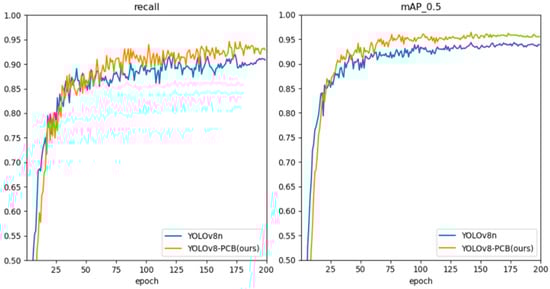 The comparison of the recall rate and mAP@0.5 curves for the models prior to and following optimization is shown in Figure 8. The blue solid line denotes the metric curve of the YOLOv8n baseline model, while the orange solid line corresponds to the metric curve of the improved YOLOv8-PCB model. As can be seen from Figure 8, both the recall rate and mAP@0.5 of the improved model have seen improvements over the previous model. Additionally, the convergence speed of the improved model has accelerated, enhancing detection precision.