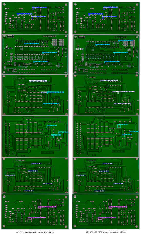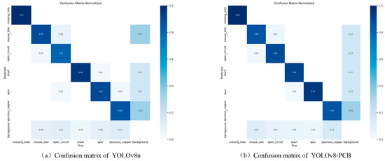 Figure 9 presents a comparison of the confusion matrices for the models prior to and following enhancement. The diagonal elements indicate the count of samples accurately predicted by the model, whereas the off-diagonal elements show the quantity of samples that were either incorrectly detected or missed by the model. From Figure 9a, it can be observed that the miss rates for mouse bite, open circuits, and spurious copper are relatively high, with lower accuracy in comparison with other defects. In Figure 9b, the values on the diagonals for open circuit and spur are higher than those in Figure 9a, with other defects being equal or showing insignificant differences. This indicates that the overall performance of the proposed YOLOv8-PCB model is superior to the YOLOv8n baseline model, and there is a noticeable improvement in the miss rate.