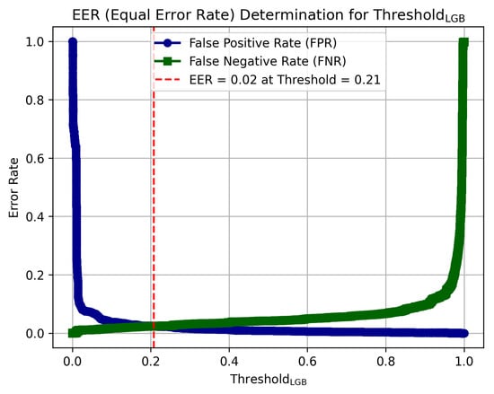We determined the optimal by using the EER method, as shown in Figure 1. In our experiment, the FNR and FPR distributions were analyzed across different threshold values. The EER was calculated to be 0.21, meaning that at this threshold, the FNR and the FPR were equal. Based on this result, we set the optimal to 0.21, ensuring a trade-off between false positives and false negatives, thereby improving classification accuracy.