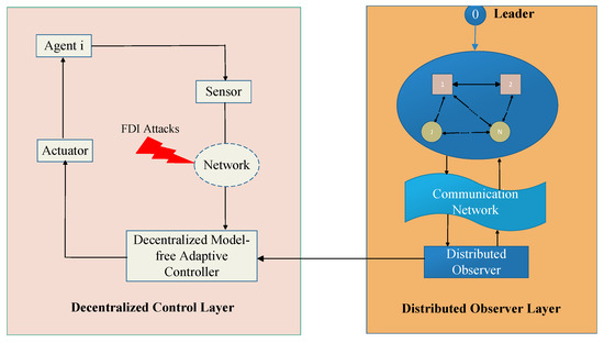 In summary, in the study of the control problem of nonlinear MASs encountering network attacks, most of the methods used are MFAC, and most of the network attacks are DOS attacks with less threat. Under aperiodic DoS attacks, researchers have used dynamic event-triggered MFAC to ensure the stability and performance of nonlinear CPSs [31,32]. The paper [33] investigates the utilization of MFAC within nonlinear multi-agent systems under the circumstances where actuator faults and DoS attacks occur, thus allowing the system to reach stability. Another paper investigated MFAC for MIMO nonlinear systems under packet dropout and DoS attacks, ensuring system stability and performance in the presence of communication disruptions [34]. However, as far as the author knows, the MFAC problem under FDI attack has also been solved [35], but there is still a lack of relevant research on the DRMFC problem under FDI attack. The proposed distributed resilient model-free adaptive control method for observer-dependent nonlinear multi-agent systems faces several challenges when it comes to implementation, computational cost, and real-time communication. Firstly, the hierarchical control architecture requires the design and integration of both a distributed observer and a corresponding distributed adaptive learning controller [36]. While this modular design helps address system heterogeneity, it can also complicate the implementation process, requiring the careful tuning of both components to ensure compatibility and optimal performance across different agents with varying dynamics. In terms of computational cost, the use of data-driven adaptive learning methods can significantly increase the computational complexity, particularly when dealing with large-scale multi-agent systems [37]. The adaptive algorithms require frequent updates to the controller parameters based on the observed data, leading to higher processing demands. This can be a limiting factor, especially when the system operates in real-time and requires fast, efficient computation to ensure stability and responsiveness. Moreover, real-time communication presents an additional challenge. The distributed nature of both the observer and controller relies heavily on the communication between agents. Ensuring timely and accurate data exchange between agents is essential for the system’s performance [38], but it can be hindered by network delays, bandwidth limitations, or packet loss, especially under varying channel fading conditions. These issues need to be carefully managed to avoid performance degradation or instability, which might otherwise occur in practical implementations. Therefore, inspired by the above research and existing problems, this paper studies how to ensure the stability and performance of nonlinear MASs through observer-based distributed resilient model-free adaptive control under FDI attacks. The main contributions of this article are as follows: