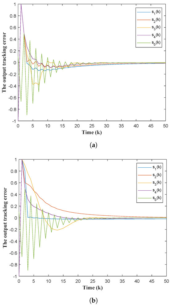 In the context of the output regulation problem for discrete-time systems, Assumption 1 serves as a standard presumption. Its primary function is to preclude the leader’s trajectory from asymptotically approaching zero as time elapses. By ensuring that the leader’s trajectory does not trivially converge to zero, this assumption facilitates a more meaningful analysis of the system’s behavior and control design. The accomplishment of the leader-follower tracking control task is guaranteed by Assumption 2. It should be underlined that all followers are required to obtain the leader’s information, either in a direct or an indirect manner. Otherwise, it would be arduous for them to precisely trace the leader’s trajectory. And in Assumption 2, the eigenvalue of matrix H has a positive real part, which is an asymmetric matrix. Assumption 3 aims to limit the maximum rate of change of the system’s output. This ensures that the system’s response remains stable and predictable, as a bounded input change will not cause an unbounded output change. In this assumption, is the variation of the system output value at two adjacent sampling moments, and is the variation of the system output value at two adjacent sampling moments. Assumption 4 imposes a universal limitation on nonlinear systems, which streamlines and expedites the design of the succeeding controller. By imposing this restriction, we ensure that the control strategies developed are applicable and effective.