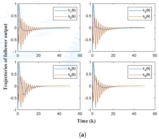 A careful examination of Figure 3a reveals that the four followers successfully complete the tracking control task. The followers are able to closely track the leader, and based on the time stamps, it can be concluded that they converge rapidly to a very small range. A comparison with Figure 3b shows that the output tracking performance achieved by the proposed control scheme surpasses that in [26]. This validates the effectiveness of the proposed control method in ensuring precise and stable tracking. Similarly, Figure 4 illustrates the trajectories of both the followers and the leader under our control method and the method presented in [26]. The small deviations observed further indicate that our followers are better able to maintain synchronization with the leader, thereby highlighting the robustness and reliability of the approach in practical applications. The possible reasons are as follows. In [26], a direct distributed control approach is used, where a single controller enables tracking. However, some followers can only indirectly receive the leader’s information through others. In contrast, the proposed hierarchical distributed control approach allows each follower to directly obtain the leader’s estimated information via a distributed observer and apply a decentralized controller for local tracking. According to Figure 5, one can obtain that the observer error can be asymptotically close to 0, which verifies the effectiveness of the designed distributed observer. That is to say, the estimated leader information can well track the primary leader .