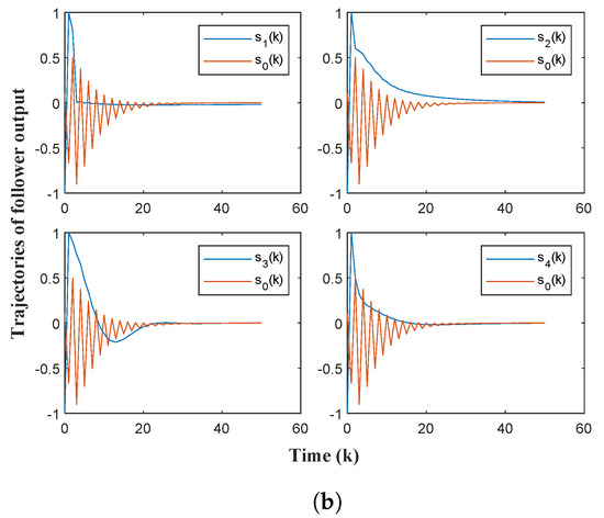The output trajectories of followers under different control methods. (a) Our control method. (b) Control method in [26].