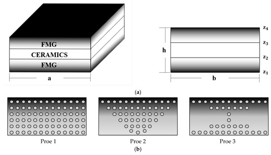 This paper studies the porous functional gradient sandwich plate, which is a symmetrical structure composed of upper and lower surface layers of functional gradient materials and a middle layer of ceramic material (as shown in Figure 1).