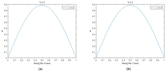 (a) Dimensionless deflection distribution along the X axis. (b) Dimensionless deflection distribution along the Y axis.