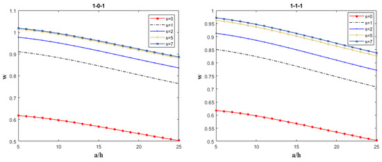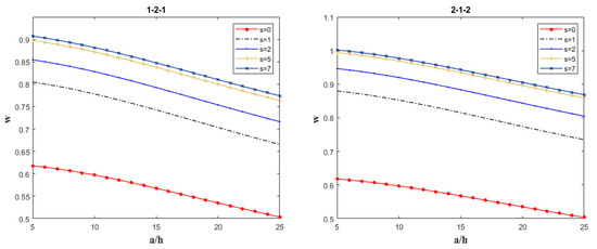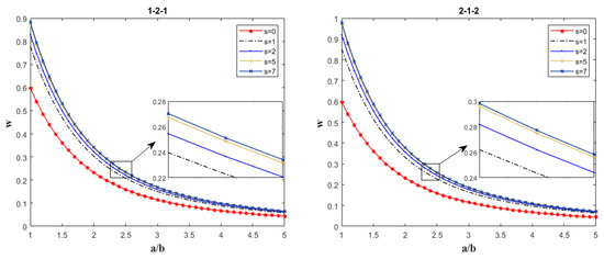 - At a given porosity level, regardless of the specific value of the volume fraction index s, the dimensionless deflection w of the sandwich plate decreases with increasing edge thickness ratio or aspect ratio.