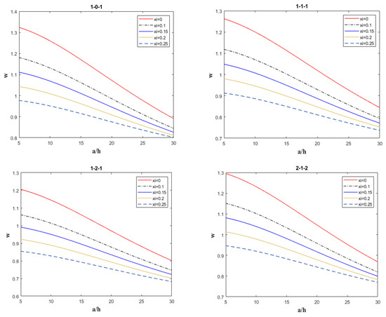 It can be seen from Figure 5 that (1) The deflection is maximum when the porosity xi = 0, and the deflection is minimum when the porosity xi = 0.25. (2) It can be seen that when the porosity is between 0 and 0.25, the deflection of the functionally gradient sandwich plate decreases with the increase in the edge thickness ratio (a/h). This rule shows that increasing the edge thickness ratio can effectively improve the bending resistance of the sandwich panel and thus reduce the deflection.