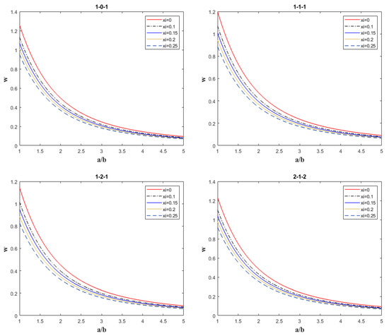 Figure 6 shows that (1) It is found that the deflection is maximum when the porosity xi = 0, and minimum when the porosity xi = 0.25. This result further validates the significant impact of porosity on the stiffness of the sandwich plate, providing theoretical support for porosity optimization in material design. (2) It is also found that when the porosity is between 0 and 0.25, the deflection of the functionally gradient sandwich plate decreases with the increase in the aspect ratio (a/b), and the deflection values tend to be similar. This phenomenon shows that the increase in the aspect ratio within a certain range can significantly improve the overall stiffness of the sandwich panel and thus reduce the deflection.
