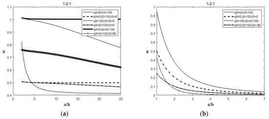 It can be seen from Figure 7 that Figure 7a shows the effect of the edge thickness ratio (a/h) of the functionally gradient sandwich plate (s = 2, xi = 0.15) containing pores (1-2-1) on the dimensionless deflection. (1) The dimensionless deflection of the sandwich plate that only bears a thermal load is larger, and the dimensionless deflection of the sandwich plate that only bears a mechanical load is smaller. (2) When thermal–mechanical loads are included (q0 = t2 = t3 = 100 and q0 = t2 = 100, t3 = 50), the deflections are between those when only mechanical loads are considered and those when only thermal loads are considered. Moreover, the deflection of thermal–mechanical loads decreases with the increase in the edge thickness ratio (a/h). (3) For sandwich plates subjected only to mechanical loads, the deflection value does not change much when a/h ≥ 10. (4) By comparing (a) and (b), it is found that the aspect ratio (a/b) has a more significant effect on the dimensionless deflection of sandwich plates than the edge thickness ratio (a/h).
