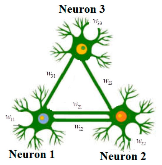 where the voltage across capacitor is the membrane potential of neuron , and is the resistance of this membrane. The term is the synaptic weight matrix, which acts as the interaction force between neurons and . The external current source is symbolized by . The remaining term symbolizes the function utilized for neuron activation. Note that an activation function is a mathematical function applied to the output of a neuron. It introduces nonlinearity into the model, enabling the network to learn and represent complex patterns in the data. Without this function, a neural network would behave like a linear regression model, regardless of the number of layers it contains. The activation function decides whether a neuron should be activated by calculating the weighted sum of the inputs and adding a bias term. This allows the model to make complex decisions and predictions by introducing nonlinearities into the output of each neuron. The most commonly used activation functions are the sigmoid, the ReLU (Rectified Linear Unit) and the tanh (hyperbolic tangent). The tanh function has several advantages over other activation functions. It normalizes the output between −1 and 1, which makes the mean values of the data closer to zero, facilitating convergence when training the network. Being centered on zero, the tanh function helps to make gradients more efficient, as it normalizes the distribution of neuron output values and allows faster updates of weights. Compared with the sigmoid function, the tanh function reduces the gradient problem to a greater extent, as its extended values make it disappear. Although the ReLU function generally performs better in this respect, the tanh function remains a good compromise. For certain types of data and models, the tanh function offers better performance than other activation functions. However, it is important to note that the ReLU function generally performs better for deep neural networks due to its non-saturating gradients. All these reasons justify why the tanh function is used in this model as the activation function of the neuron. It is easy to implement with both analogue and digital components. In this work, in order to construct an HNN model with only three neurons and simplified mathematical structure, but exhibiting complicated dynamic behaviors, we consider the model developed in [], where the following modification is set: , . The connection topology of the elaborated HNN is illustrated in Figure 1.