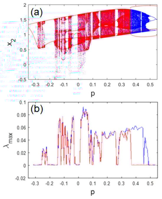 Bifurcation diagram (a) and corresponding graph of maximum Lyapunov exponent (b) versus the unique control parameter , varying in the increasing (blue curve) and in the decreasing (red curve) directions.