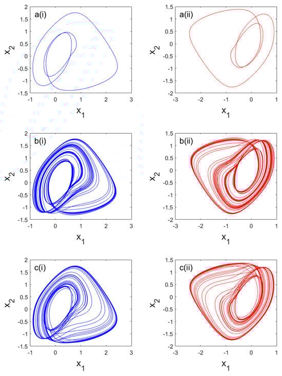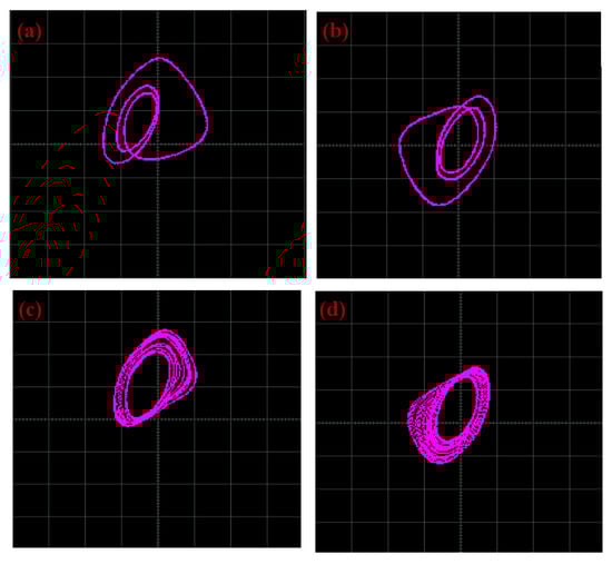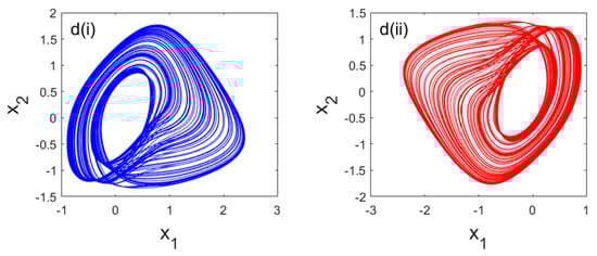 Some asymmetric phase profiles of system (3) generated for diverse values of the control parameter setting as follows: for (a(i,ii)); for (b(i,ii)); for (c(i,ii)); and for (d(i,ii)). The initial conditions are (, , ) = (0.7454, 1.7542, 4.9817).