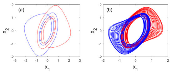 From Figure 2, we can see that chaos appears in the system through the phenomenon of the period-doubling scenario. There exist some windows where the system develops periodic behavior. The hysteresis phenomenon is observed in the areas where the blue and red curves do not completely superpose. The attractors coexist in these areas.