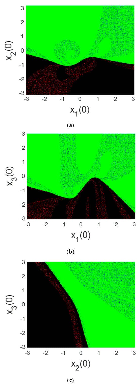 To further illustrate the phenomenon of the coexistence of patterns, some cross sections of the basin of attraction of system (3) in some plans are computed and shown in Figure 5.