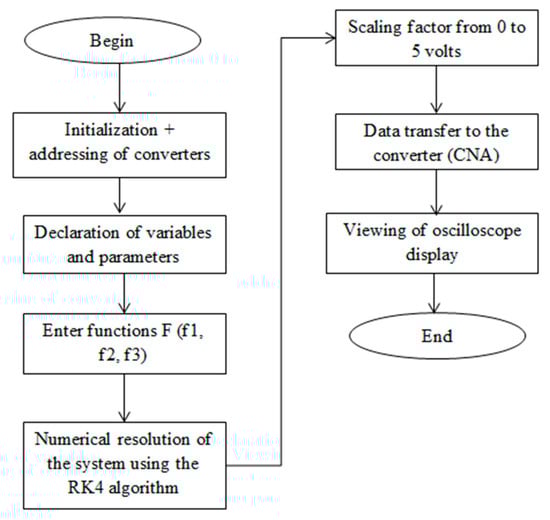 According to Figure 7, the implementation procedure starts with the initialization and addressing of the converters. This step is followed by the declaration of variables and system parameters. Because the microcontroller cannot implement directly a continuous time system, the set of HNN equations (system 3) are converted into its digitalized format. The digitalized system is solved using the Runge–Kutta algorithm, which is described below.