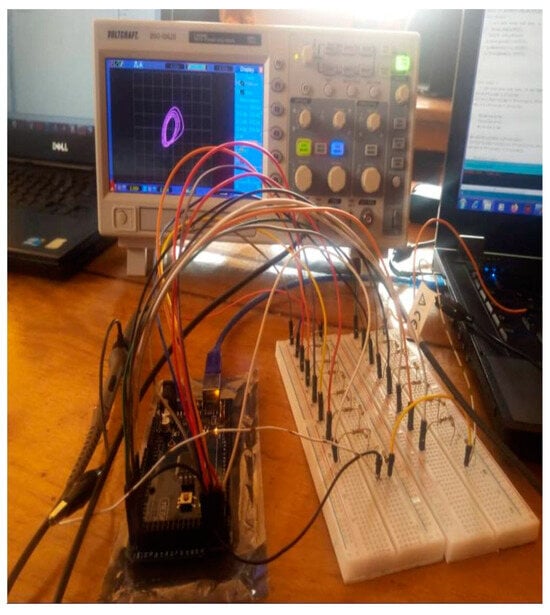 The simple third-order Hopfield Neural Network modeling by system (3) is implemented using an Arduino board. Compared with implementation using electronic components, implementation using an Arduino board offers advantages such as flexibility, speed, stability and reliability, and the possibility of easily changing the system’s parameter values and initial conditions. The hardware platform includes an Arduino Mega 2560 microcontroller board, two D/A converters and a digital oscilloscope. The Arduino board is used for the implementation of the system. D/A converters are used to convert digital signals generated from the implementation step to analog signals, which can be visualized with the oscilloscope. The essential stages in the implementation of a chaotic system based on an Arduino board are described in the flowchart in Figure 7.