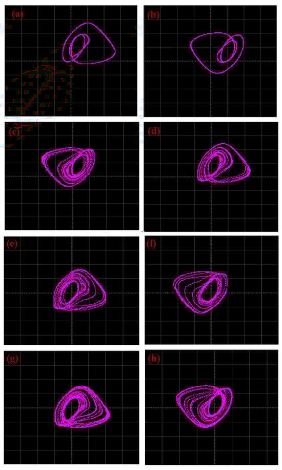 Asymmetry phase profiles showing the implementation of a simple third-order Hopfield Neural Network through an Arduino board. These phase portraits are obtained with the following values of the unique control parameter : for (a,b); for (c,d); for (e,f); and for (g,h). The initial conditions are (, , ) = (0.7454, 1.7542, 4.9817).
