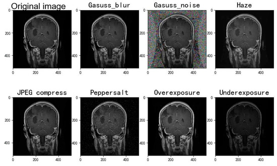 Training the deep learning model requires a large number of training samples. The magnetic resonance imaging dataset of brain tumors we use contains a total of 5712 original images of four tumor types. Considering the particularity of medical images and the complexity of the model’s tasks, we also need to expand the dataset to ensure the robustness of the model. In the actual application scenarios of medical images, we often encounter problems such as insufficient light or overexposure, machine hardware problems, network transmission fluctuations, etc. After the full investigation and study of true distorted medical images, we summarize the common distortion types into the following seven types: Gaussian blur, Gaussian noise, haze effect, JPEG compression, salt and pepper noise, overexposure, and underexposure, which are close to the true distortion effects and cover the types of distortion in most cases.