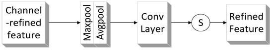 The working principle of the spatial attention module is shown in Figure 6. The input image feature map processed by the channel attention module passes through the MaxPool layer and AvgPool layer, and then uses a standard convolution layer for connection and convolution. Then, the sigmoid activation function is used to obtain the weight value of each feature point of the feature map, and finally the weight is added to the feature layer by multiplication.