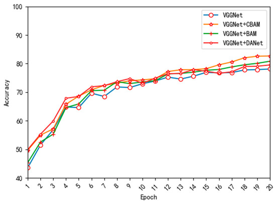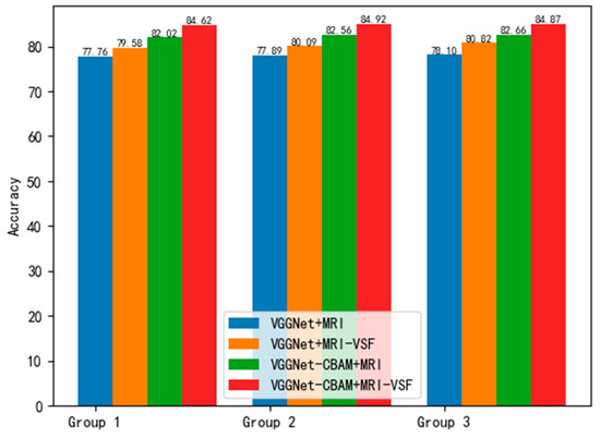 After the accuracy stabilized, we selected three rounds of experimental results to enhance the stability of the results. They were divided into three groups, and their comparison is shown in Figure 8. For each group, there are four schemes, the first and second schemes are based on the VGGNet model, and the third and fourth scheme are based on the VGGNet+CBAM model. For the comparison, the second and fourth schemes have visual saliency fusion. We can see that Model B (VGGNet+CBAM) with the addition of the CBAM module performs better than Model A (VGGNet), indicating the improvement effect of the attention mechanism module on the model. Taking Group 3 as an example, Scheme 2 (VGGNet model with VSF) shows a 3.5% improvement in accuracy compared to Scheme 1 (VGGNet model without VSF), while Scheme 4 (VGGNet+CBAM model with VSF) shows a 2.7% improvement in accuracy compared to Scheme 3 (VGGNet+CBAM model with VSF), we can see that the dataset processed by visual saliency fusion has improved its performance in model training. Compared to Scheme 1, Scheme 4 has improved its accuracy by at least 8.7%, indicating that the combination of the CBAM module added model and the visual saliency fusion processed dataset achieved the best results.