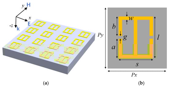 The unit structure utilized in this study, the Co-SRR, is depicted in Figure 1. This design can be visualized as two symmetrically positioned split-ring resonators (SRRs) converging at the connecting bar located centrally within the Co-SRR, aligned along the y-direction. This component will be referred to as “the middle bar” in subsequent text. The gaps on either side of the middle bar divide the outer frame into two sections, designated as “the upper frame” and “the lower frame” hereinafter. The incoming THz lightwave is polarized in the x-direction and propagates along the negative z-axis, striking the device’s surface perpendicularly, as exemplified in Figure 1a. Figure 1b defines the parameters of the unit structure. The length (l) and width (s) of the outer frame are 64 µm and 56 µm, respectively. The line width (w) is 4 µm. The periods of the unit structure in both the x-direction (Px) and y-direction (Py) are both 100 µm. These parameters remain constant throughout the study. Prior to any changes being introduced, the gap size (g) is set to be 4 µm and centered at y = 0, resulting in widths of 30 µm for both the upper (b) and lower (a) frames. The simulation software, 3D finite-difference time-domain (FDTD) solutions, was used to obtain the transmission spectra of the proposed structure. It was also used to analyze the electrical (E) and magnetic (H) field distributions within the structure at resonant frequencies. To achieve this, a unit structure was designed within the software, with periodic boundary conditions applied in the x-y plane and perfectly matched layer (PML) boundaries utilized along the z-direction. The substrate material chosen was silicon dioxide (SiO2 (Glass)–Palik model from the software’s material database), with a thickness of 50 µm, while the metal resonator was made of aluminum (Al-CRC model from the software’s material database), with a thickness of 0.5 µm. The chosen materials have been well characterized and widely used in the field of research. Such metamaterial devices can be prepared through mature micro-fabrication processes, including steps of lithography, metal deposition, and lift-off [24,25]. The transmission spectra were measured at the bottom of the substrate, and the resonant frequencies were determined by identifying the frequencies at which local minima in transmission amplitude occurred. The E-field and H-field distribution maps were observed at the interface between the metal layer and the substrate.